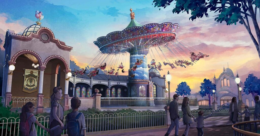 Beim neuen familienfreundlichen Fahrgeschäft Raiponce Tangled Spin werden Gäste die berühmte Laternen-Szene aus dem Animationsfilm Rapunzel – Neu verföhnt auf besondere Weise erleben. In kunstvoll gestalteten Gondeln werden sie sich unter einem Himmel aus schwebenden Laternen drehen, umgeben von Fresken, die Rapunzels Abenteuer zeigen.