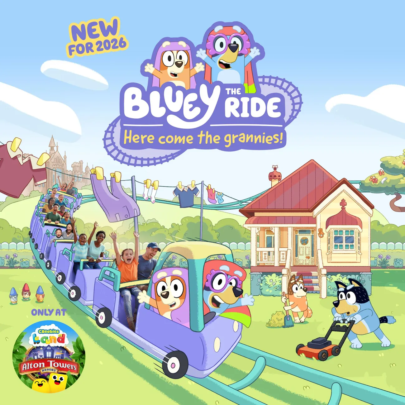 „Bluey und Bingo verkleiden sich als die Omas Janet und Rita und treiben in Blueys Garten allerlei Oma-Streiche. Dabei rasen sie über sanfte Hügel, um Kurven herum und durch bunte Bäume, Blumen und verspielte Überraschungen.“ (Quelle: Alton Towers)